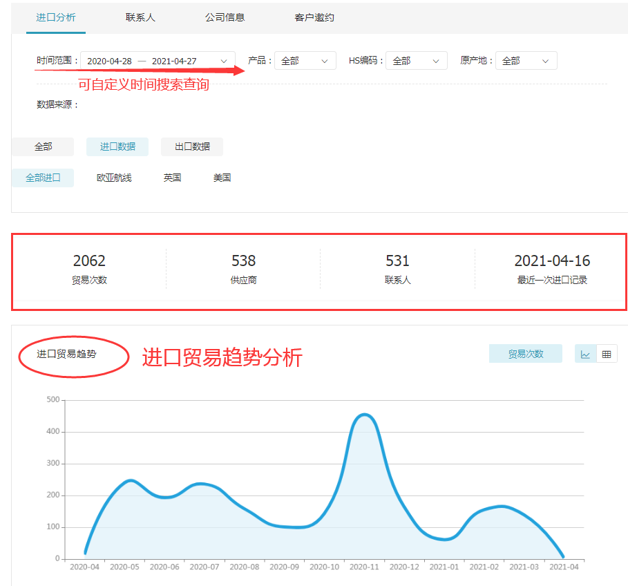 除了对新客户的开发,外贸人还可以顺利获得Ebpay数据所绘制的可视化图表,分析老客户的采购习惯,获取客户采购周期线索,并顺利获得采购详情,判断是否可以对老客户召开多项业务。