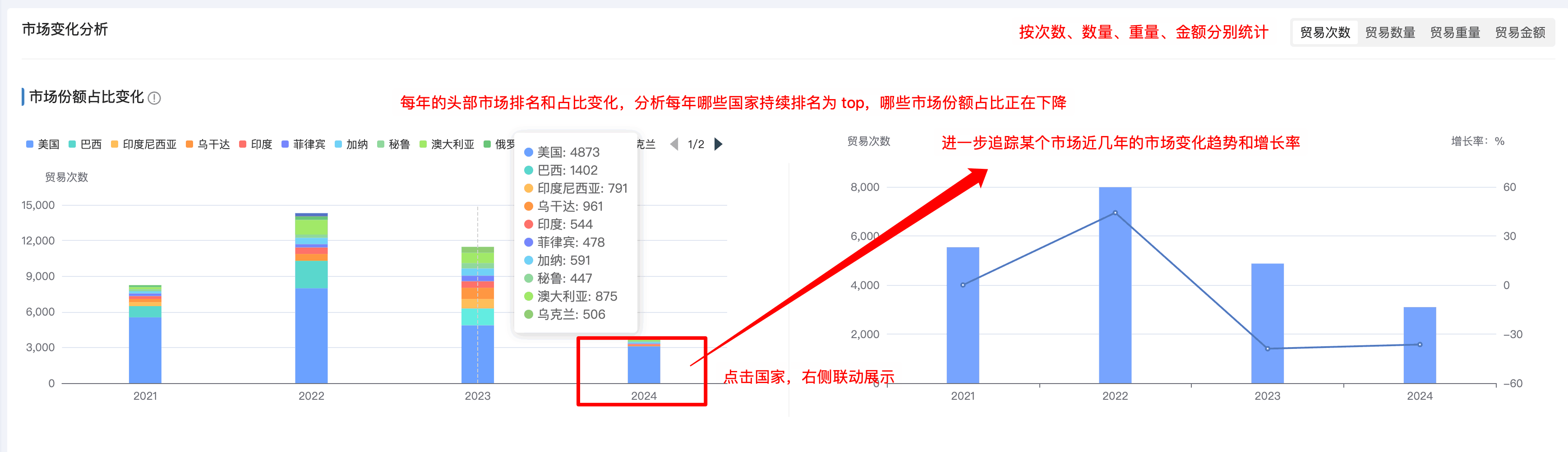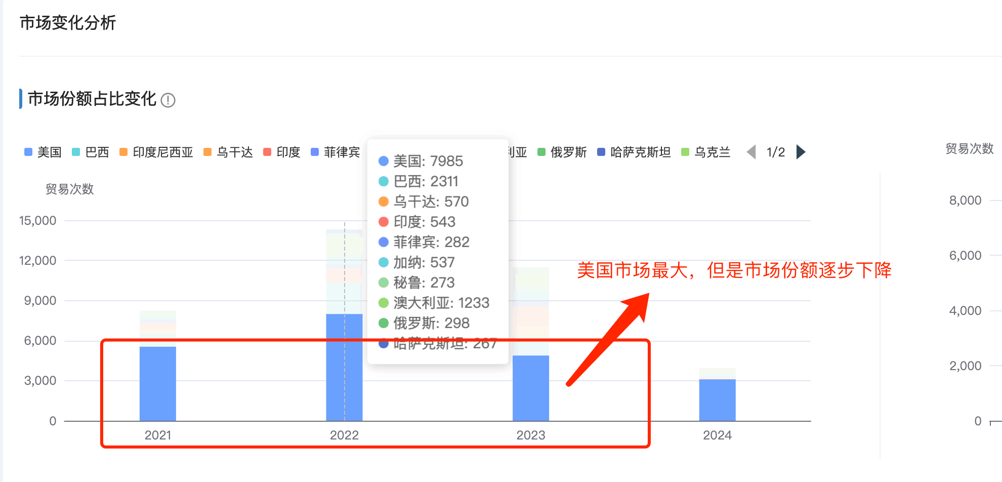 1. Ebpay商情洞察市场分析新增「市场占比变化分析」:分析每年的头部市场的占比排名和变化,哪些市场持续排名在头部,哪些市场排名逐渐下滑甚至消失在top之外的。