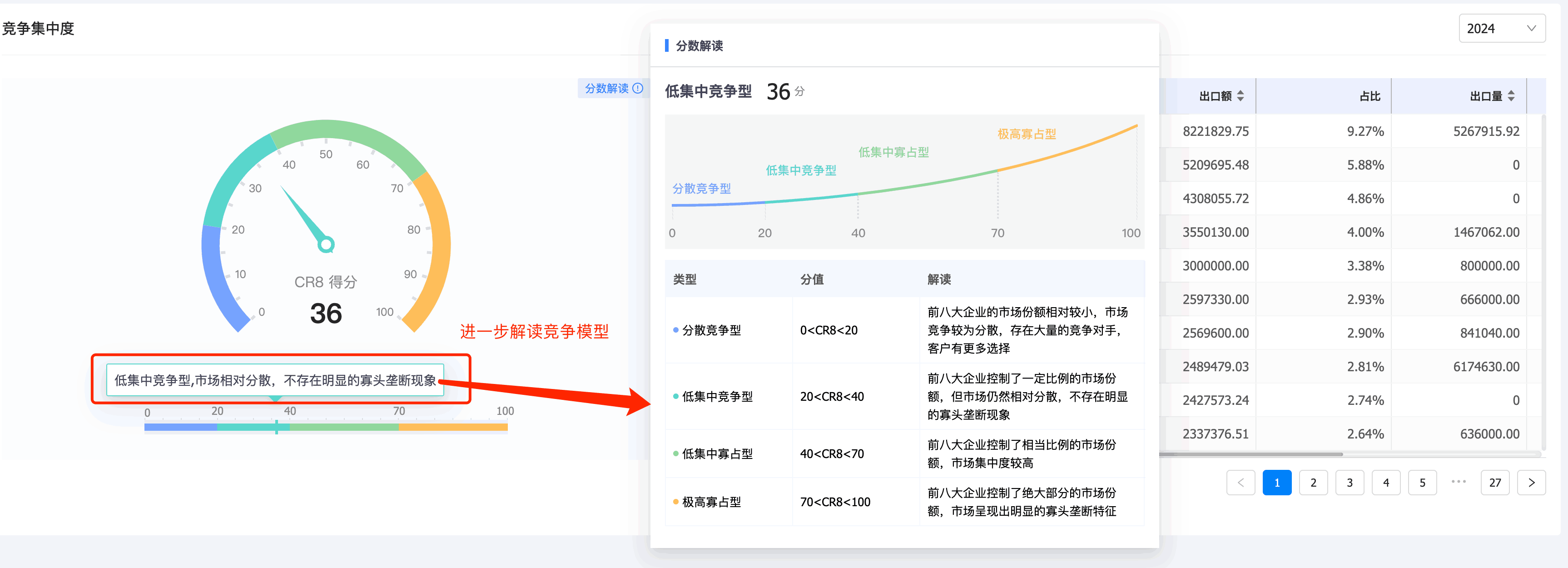 3. Ebpay商情洞察竞争分析新增「竞争集中度分析」:基于行业集中度(Concentration Ratio)理论来计算目标产品竞企竞争集中度,出口目标产品前8家最大的企业所占市场份额的总和,是对整个竞争市场结构集中程度的测量指标