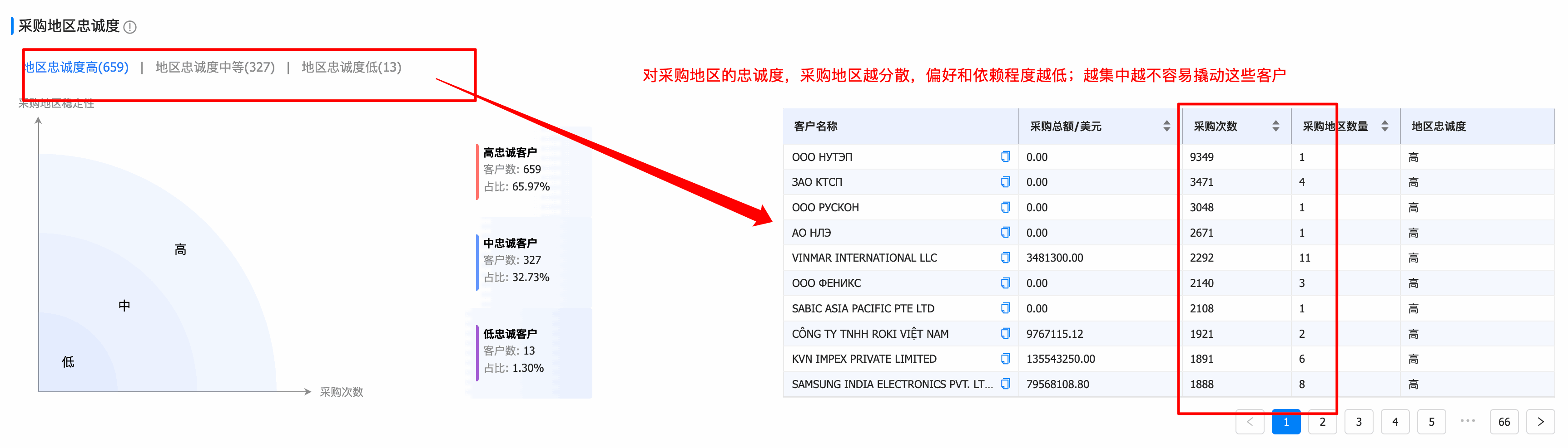客户的忠诚度可分别从「对供应商的忠诚度」、「对采购地区的忠诚度」、「采购产品的忠诚度」三种维度分析。顺利获得衡量客户对采购商的忠诚度、地区忠诚度、产品忠诚度,区分高忠诚度、低忠诚客户,帮助企业识别机会较大的客户群体。